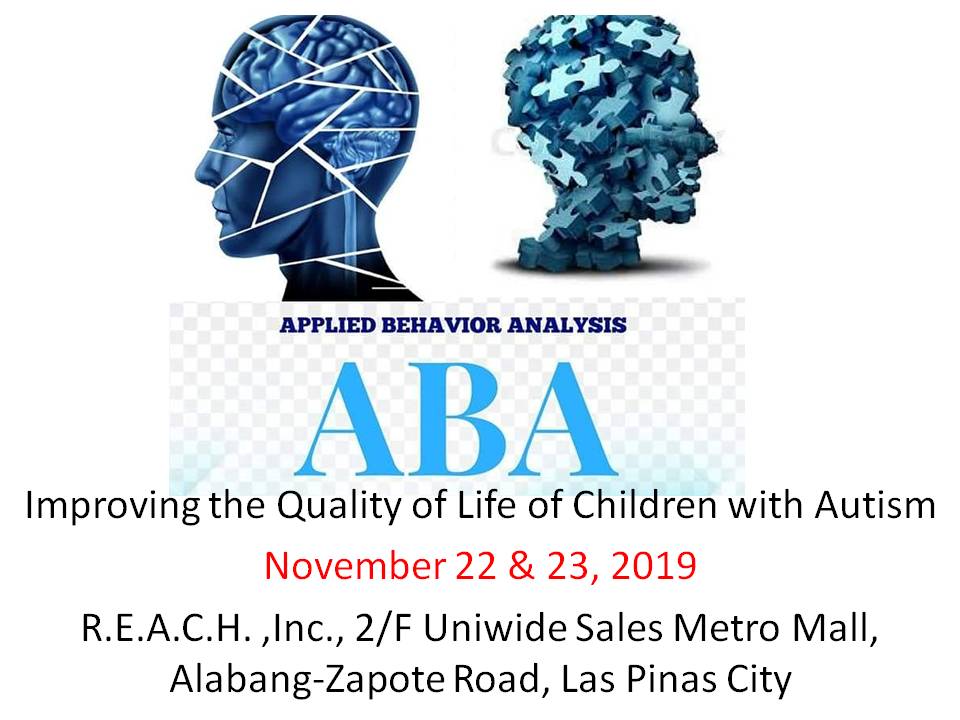 WHAT: Applied Behavior Analysis:Improving The Quality Of Life Of Children With Autism & Other Developmental Disorders TIME: 9 AM to 5 PM WHERE: R.E.A.C.H. Inc., 2/F Uniwide Sales Metro Mall, Alabang-Zapote Road, Las Pinas City.